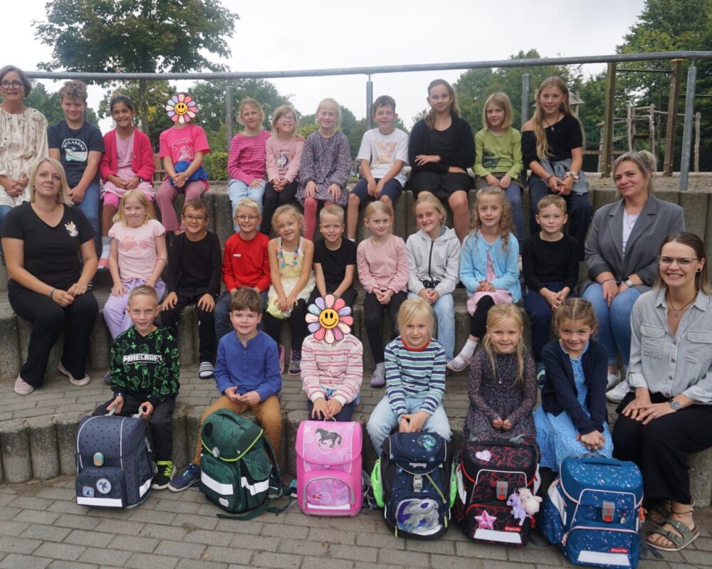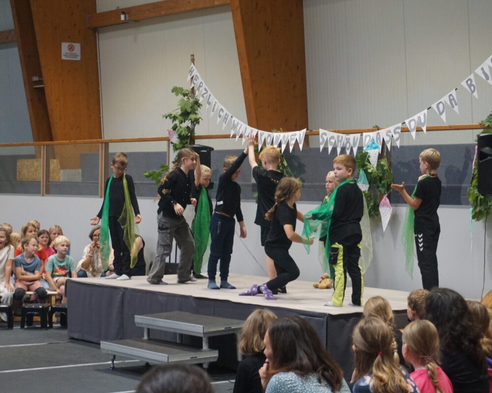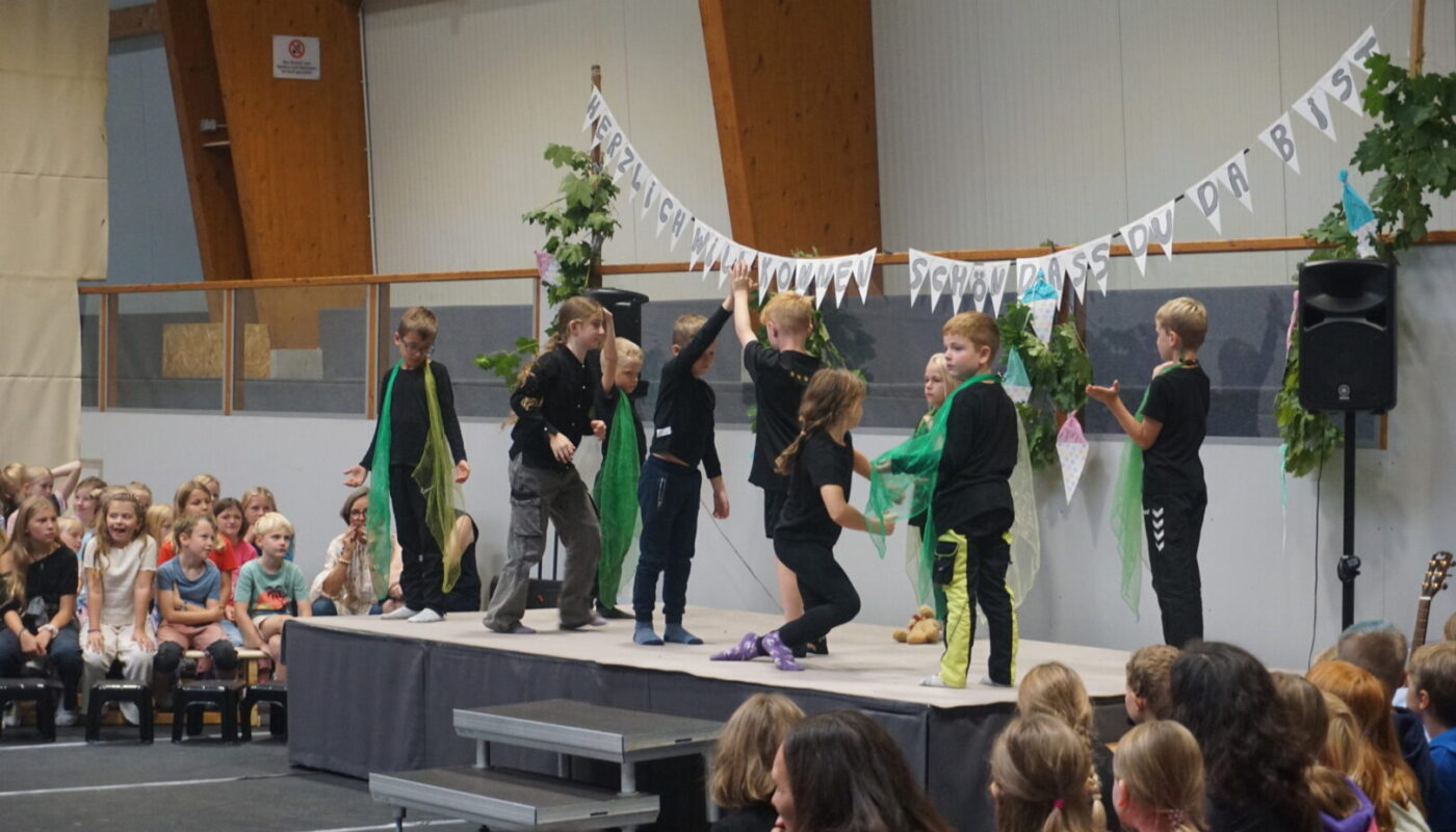 Wir freuen uns über 32 neue Schüler und Schülerinnen an unserer Schule. Am 4. September wurden die Kinder aus dem 1. Jahrgang nach einem Einschulungsgottesdienst in der Sieverstedter Kirche in der festlich geschmückten Turnhalle begrüßt. Gemeinsam mit Frau Ohlsen und Frau Roggensack hatten die Kinder aus dem 2. bis 4. Jahrgang ein buntes Programm vorbereitet. So überraschte der Chor die Gäste und die neuen Schüler und Schülerinnen z.B. mit einem englischen Lied und das Theatermodul präsentierte ihr neues Theaterstück. Nach dem Programm ging es für die Biber, Luchse, Wölfe, Dachse und Füchse in die Lerngruppenräume. Begleitet von dem Lerngruppenlied und entlang des Spaliers der Bären startete der erste Schultag für unseren 1. Jahrgang.