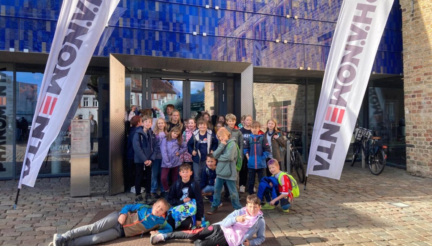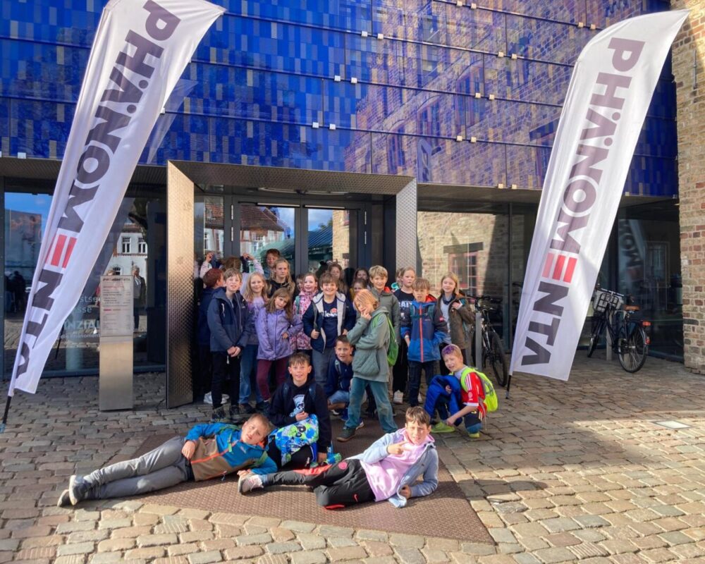 Im Rahmen unserer Vorhabenwoche machte sich die gesamte Schule am 5. Juni 2025 mit drei Bussen auf den Weg nach Flensburg ins Stadttheater. Hier erwartete die Kinder das Kinderkonzert “Die musikalische Zeitreise” von und mit Ralf Schlingmann und Jens Wischmeyer. Die Kinder waren gefesselt von der Musik und den zwei Orchestermusikern, die die Kinder auf eine Zeitreise in längst vergangene oder noch weit vor uns liegende Epochen mitnahmen. Sie reisten mit den kleinen und großen Zuschauern und Zuschauerinnen in die Steinzeit, ins Mittelalter und zu Ludwig dem 14. und erlebten dort nicht nur musikalische Abenteuer. Außerdem machten sich die Kinder gemeinsam mit dem Orchester auf den Weg in das Jahr 3000. Auch hier konnten sie in eine andere Welt eintauchen, die von dem Orchester in Klang umgesetzt wurde. Neben der Musik galt es auch, “die Geschichte der Instrumente zu erforschen: Wie sahen wohl die Vorfahren unserer Waldhörner aus, und was könnte es in der Zukunft alles geben?”